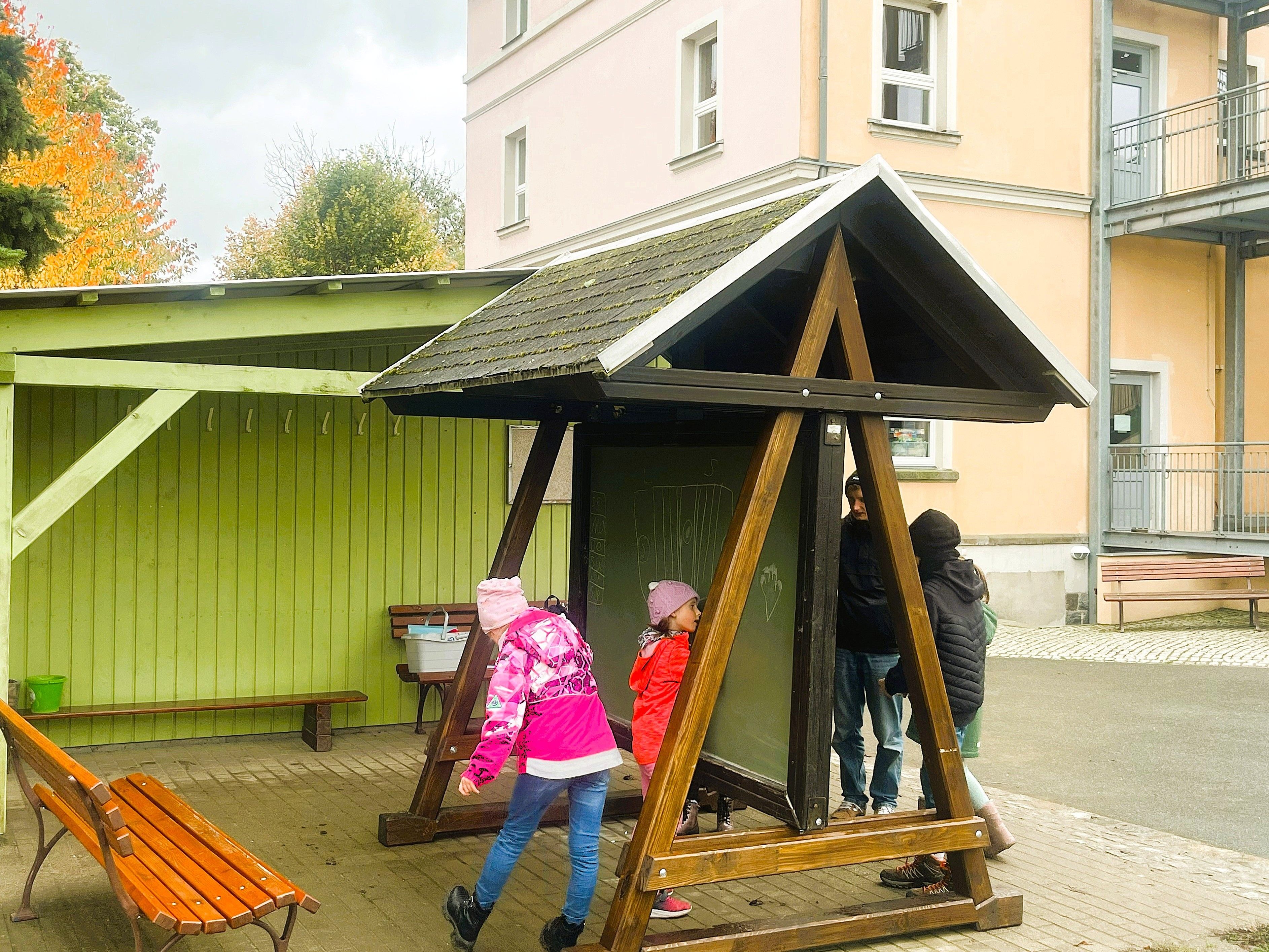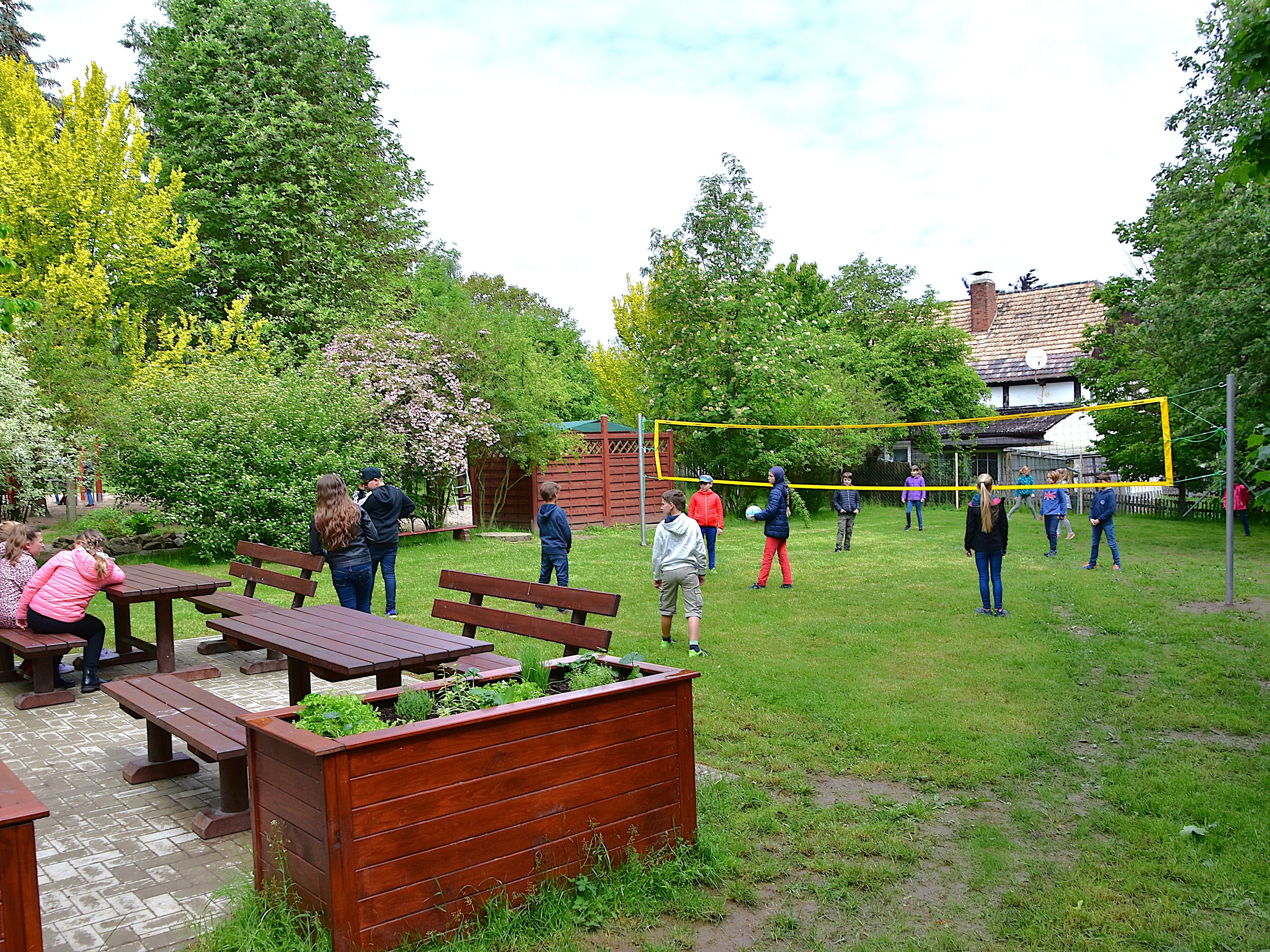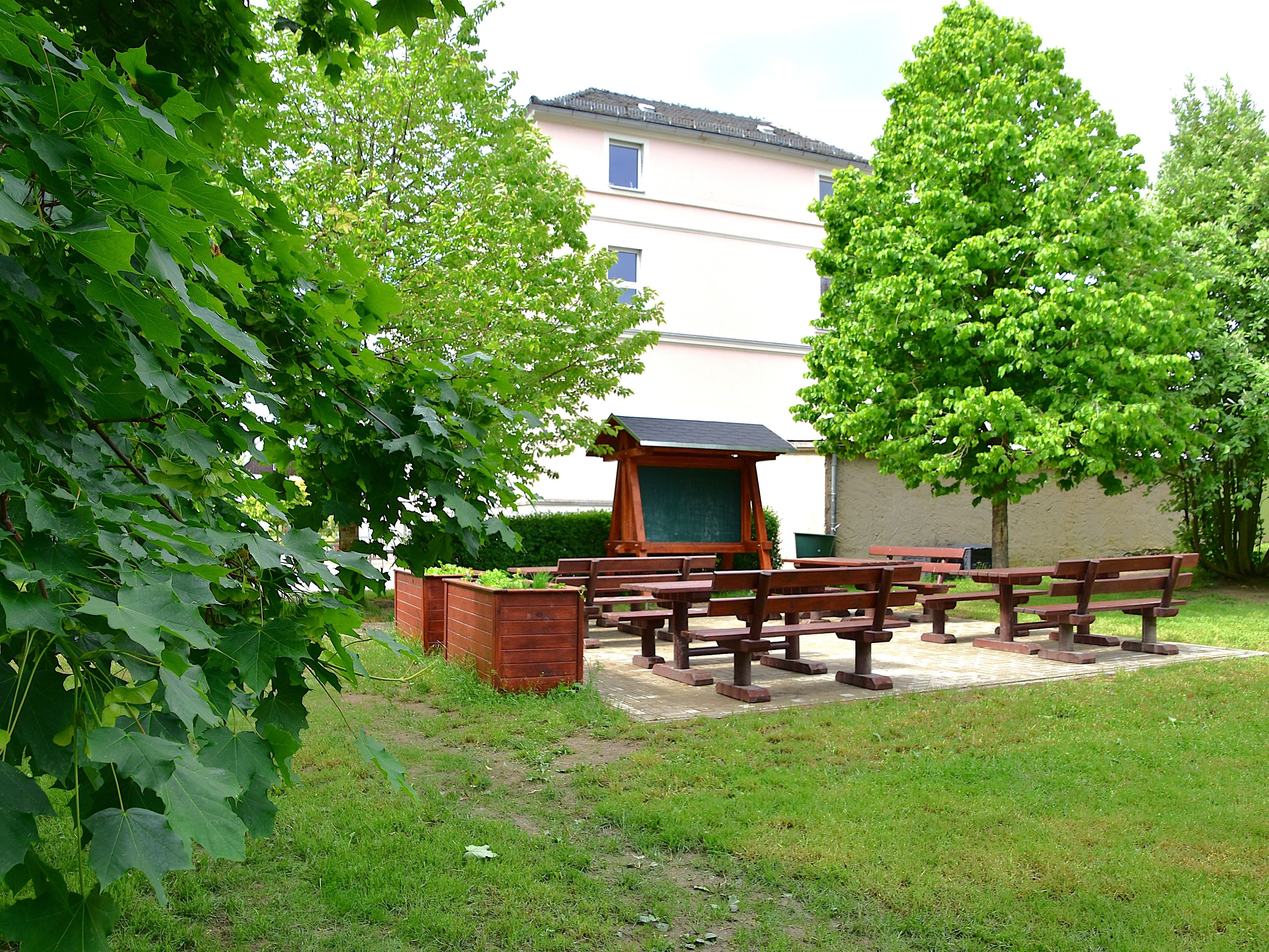 Außenbereich (ca. 1250qm) wird als Spielplatz, zum Schulgarten und für das grüne Klassenzimmer genutzt. Er bietet den Kindern genügend Raum,