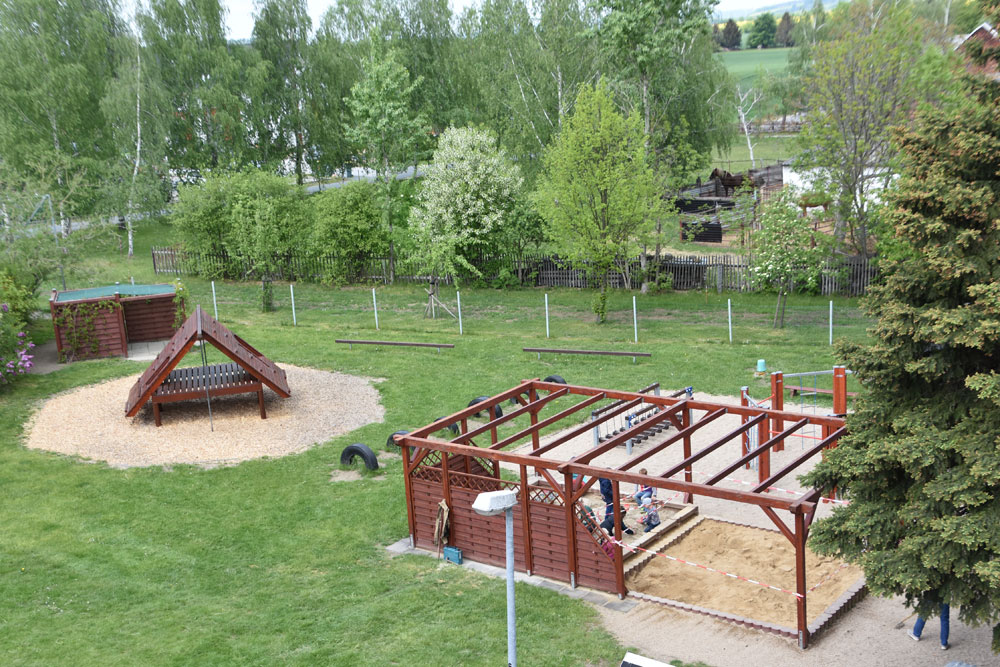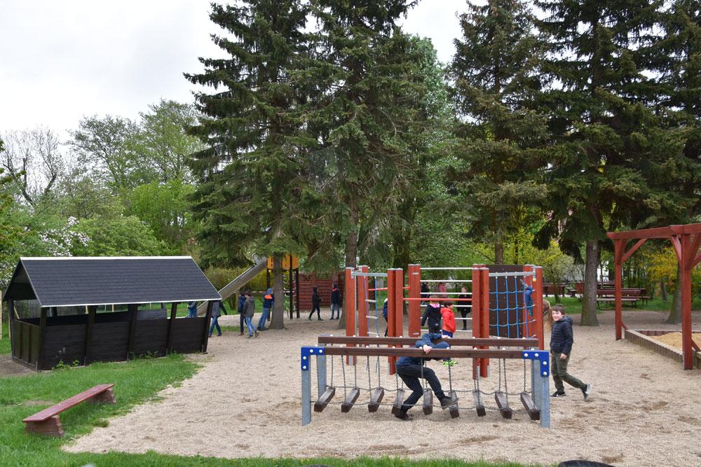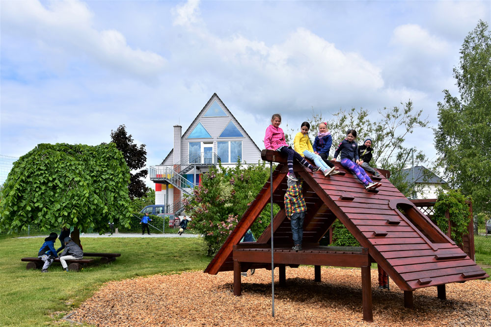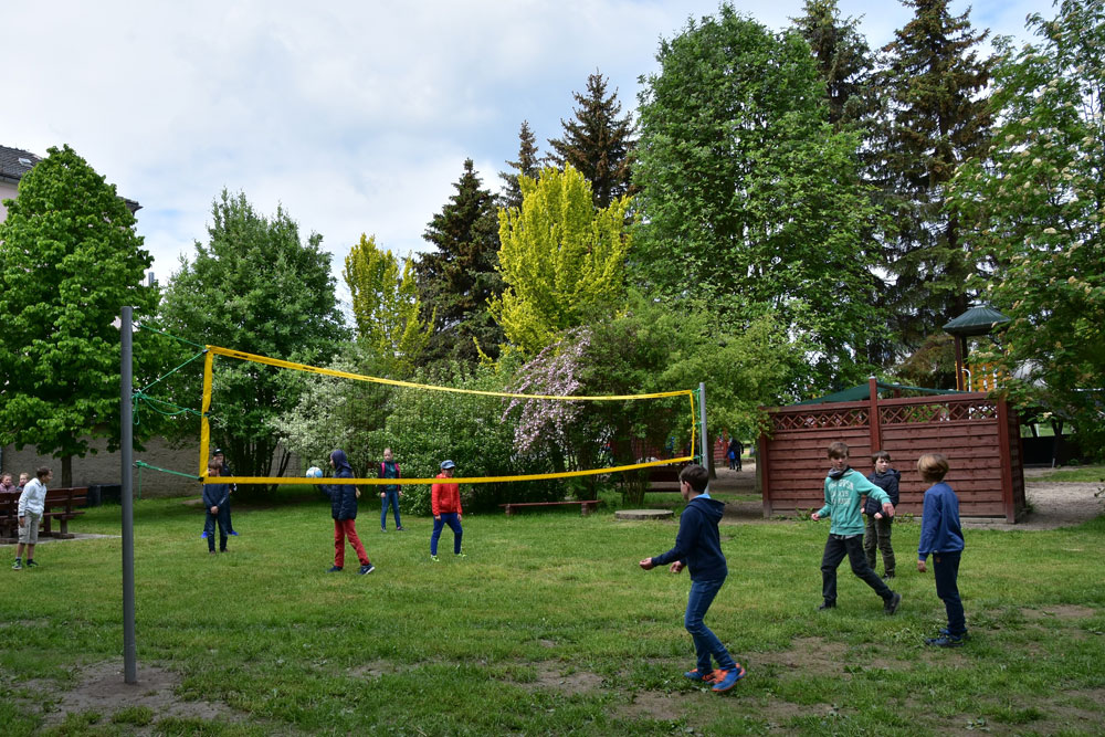 Außenbereich (ca. 1250qm) wird als Spielplatz, zum Schulgarten und für das grüne Klassenzimmer genutzt. Er bietet den Kindern genügend Raum,